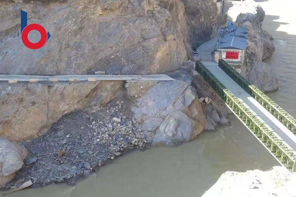 江蘇貝雷鋼橋有限公司派專門的技術人員前往甘肅省甘南藏族自治州迭部縣,架設橋型四排單層加強型(QSR)鋼橋,貝雷鋼橋架設的鋼橋使用200型產品,全橋長45.72米,屬于單跨橋,整個橋面凈寬 4.2米,荷載55噸。